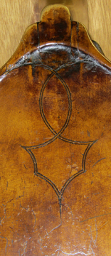 | This Purfled design in the upper Back Button area is quite different as compared to the other imported Bohemian/Germanic patterns seen on imported brands like Wilfer, Juzek, Morelli, Pfretzschner, Hofner and others. The Scroll and Neck Button is handsomely done as well. |